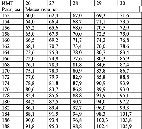 Таблица 4. Значение ИМТ, соответствующих избыточной массе тела.