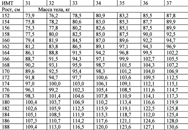 Таблица 5. Значение ИМТ, соответствующих ожирению.