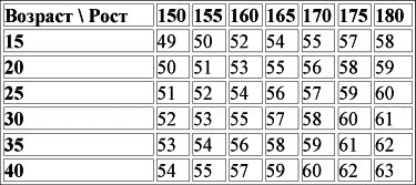 Вес = 50 + (рост – 150) × 0,75 + (возраст – 20) / 4.