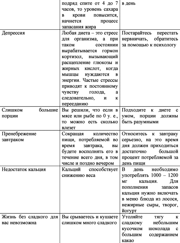 Причиной приостановки уменьшения веса могут стать предменструальный синдром и критические дни, побочные эффекты голодания, длительные застолья, возвращение в рацион соли, потеря лишних килограммов на проблемных участках тела, достижение оптимального веса, увеличение мышечной массы, депрессия, слишком большие порции пищи, пренебрежение завтраком, недостаток кальция. А может, просто жизнь без сладкого для вас невозможна.