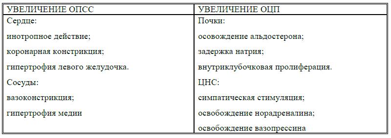 Все известные физиологические сердечно-сосудистые и нейроэндокринные эффекты. А II опосредованы АТ1-рецепторами. Все они способствуют повышению АД, развитиюгипертрофии левого желудочка, утолщению стенок артериол, что способствует уменьшению их просвета. Эффекты АН, которые опосредуются АТ2 рецепторами, – вазодилятация и торможение пролиферации клеток, в том числе кардиомиоцитов, гладкомышечных клеток. Таким образом, через АТ2-рецепторы АТП частично ослабляет свои эффекты.