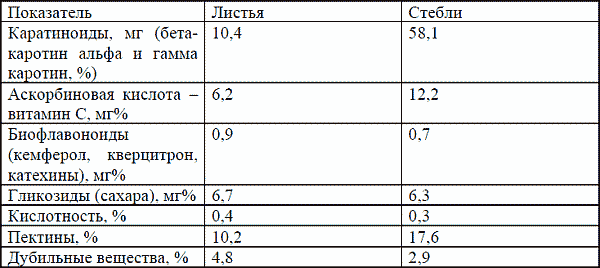В результате активных исследований российскими учеными был установлен следующий биохимический состав листьев и стеблей каллизии душистой (см. табл. 1).
