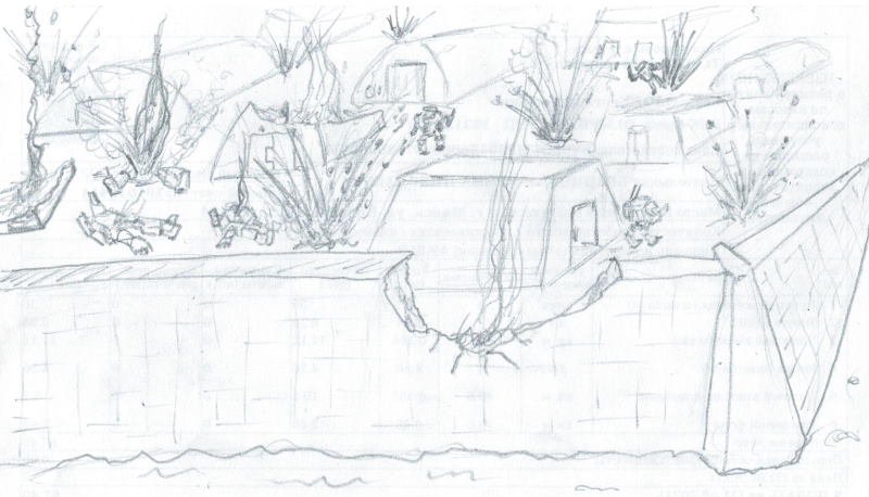 Большой боевой 2-местный неспешно шагающий робот почти 60 тонн весом и около 6 метров ростом, вооруженный арсеналом на любой вкус, цвет и размер, набрал скорость, чтоб, маневрируя, уклониться от падающих снарядов. Затем он совершил прыжок и растворился прямо в воздухе словно призрак, распылившись на тысячи и сотни тысяч песчинок, кружащихся повсюду.