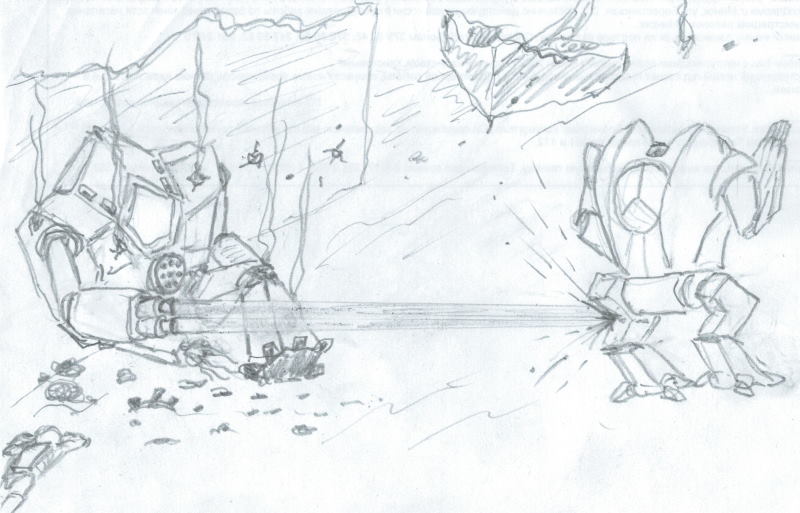Выбив северные ворота одним мощным выстрелом с 2-х тяжелых термо-ударных орудий «Голема», Бомбаста сразу же сменил позицию, прыгнув на 50 метров в сторону от входа. Не дожидаясь пока рассеется пыль и грязь, он прыгнул обратно и влепил длинную огненную дугу из роторно-реактивной пушки прямо вдоль прохода от разбитых ворот вглубь базы. Грохот разрывов и снопы искр с той стороны дали ему понять, что там их ждали. «Не дождетесь!». Бомби выстрелил сразу из всех четырех минометов накатными минами туда, где только что грохотало и снова сменил позицию, оказавшись еще на 20 метров в стороне от ворот за стеной базы.
