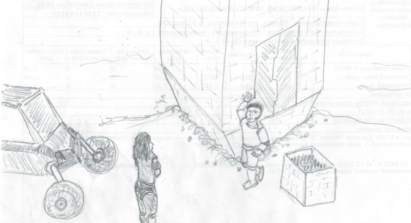 Из машины вышли двое. Первый в светлом комбинезоне торговой гильдии тот, что повыше, зашел к машине сзади и достал большую метровую коробку с емкостями чего-то жидкого. Следом вышла женщина с копной черных вьющихся волос в темно-синем сплошном костюме и с темно-красными полосками на плечах и груди. Тот, кто нес контейнер с напитками, подошел к массивной колонне и, поставив ящик возле себя, облокотился.