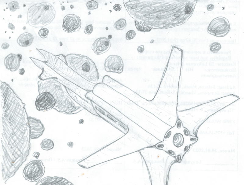 Появившись будто из ниоткуда, вытянутый словно труба с «заострением» на конце космический корабль почти сразу же попал в сильный астероидный «дождь». Однако все это была «мелкая морось». А вот «капли» по крупнее маячили уже «на горизонте».