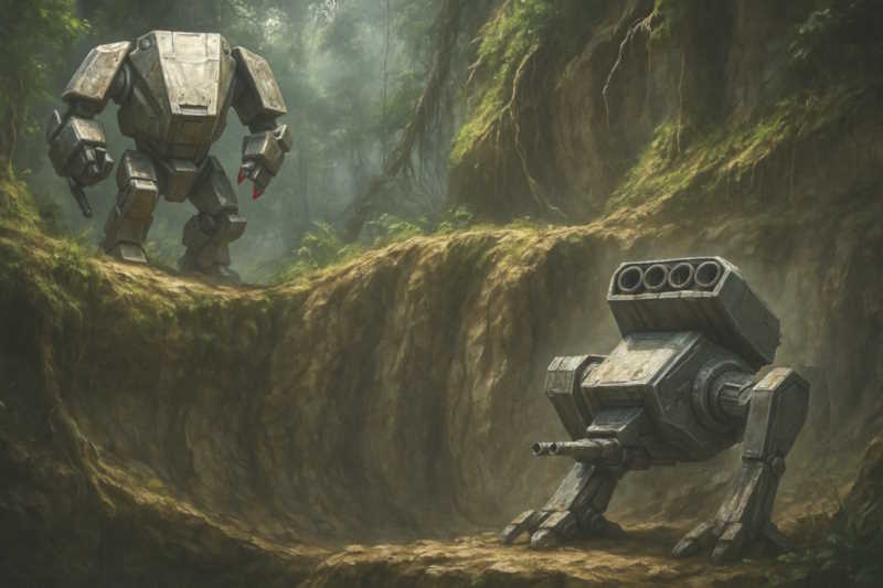 «Грей» тем временем оторвался от преследования, пропустив лишь еще одну подачу по целой ноге, которая так же выдержала детонацию, потеряв в лишь часть защитного покрытия. Путь в сторону опушки был ей теперь заказан. 20-тонный более легкий «Ганап» Тулы мог совершать прыжки, не связываясь с зарослями и не прогрызая путь среди лиан. Робот противника господствовал над полем боя и издевался над нею.