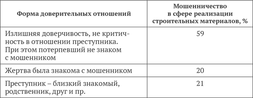 Обратим внимание, что в 53 % случаев у потерпевших до момента совершения мошеннических действий в сфере реализации строительных и отделочных материалов наблюдалась склонность заключать сделки на подозрительных условиях. Такие лица подписывали договоры купли-продажи и поставки (в т. ч., при помощи электронных средств), передавали денежные средства, чрезмерно доверяя малознакомым людям.