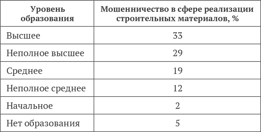 Таблица 2.9. Распределение потерпевших от мошенничества в сфере реализации строительных материалов по уровню образования