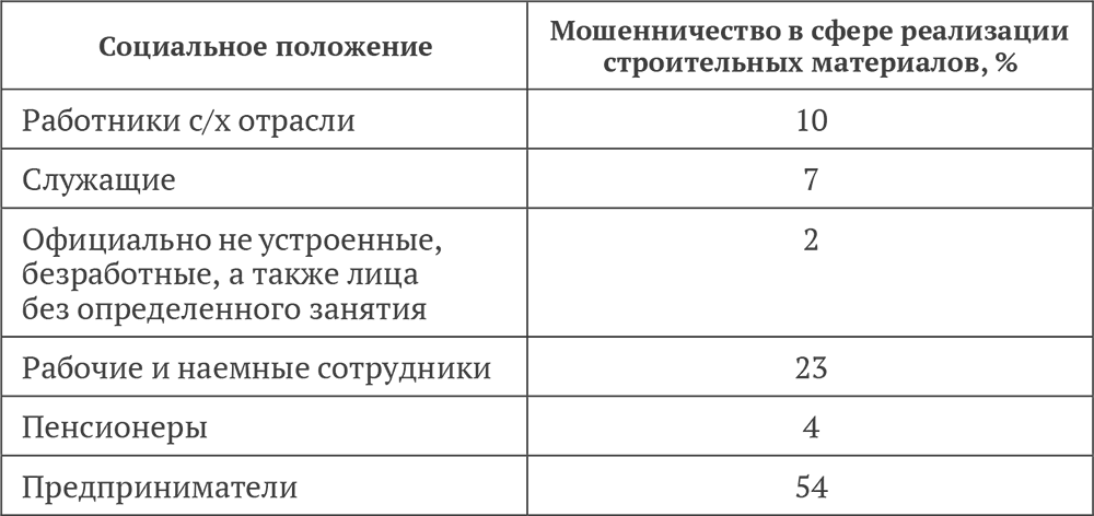 Таблица 2.10. Распределение потерпевших от мошенничества в сфере реализации строительных материалов по социальному положению