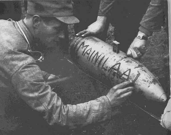 Финские артиллеристы надписывают на снаряде название деревни, где началась Зимняя война