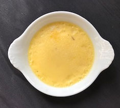 Нагреть духовку до 140°С. Влить молоко в желток, помешивая венчиком – не делая мусс. Посуда для крем-брюле – обязательная форма-блюдце с невысоким бортиком. Налить массу в формы одинаковой высоты, чтобы одновременно приготовились все порции. Поставить в духовку на 20–30 мин. Готовность определяется так: масса отзывается при легком потряхивании, имея желеобразную структуру.