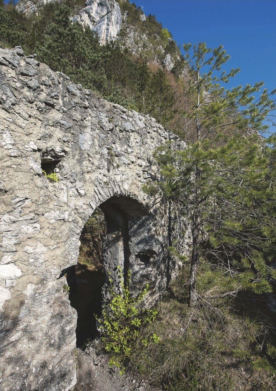 ➜ Auf der heute slowenischen Seite kann man einen Blick in den verschlossenen Kaiser-Franz-Josef-Hilfsstollen werfen. Er befindet sich südlich von Log pod Mangartom und ist „indirekt“ beschildert: Auf der Straße nach Bovec steht nach dem Friedhof rechts eine kleine Kapelle, davor ein Hunt. Wer hier rechts abbiegt, kommt direkt zum Stollen, vor dem eine kleine Open-Air-Ausstellung über die Ereignisse im Ersten Weltkrieg und den Bergbau informiert.