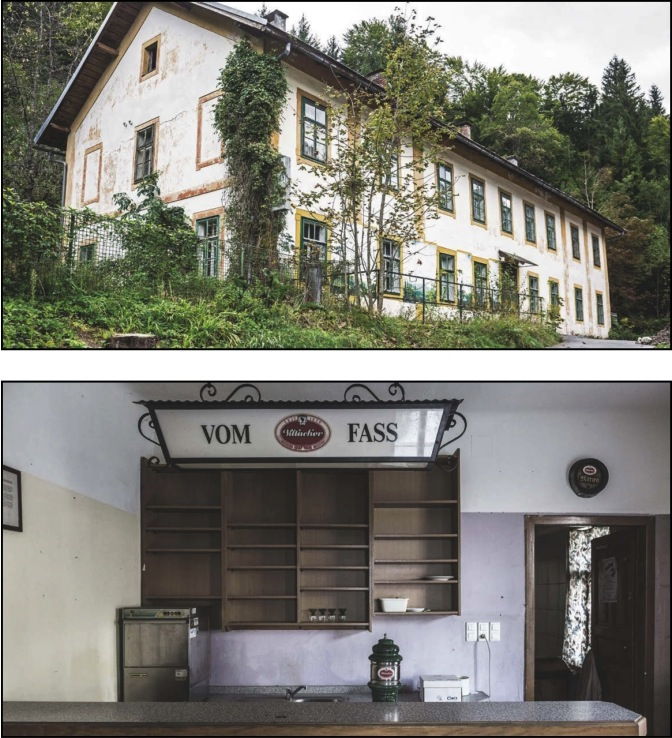 Womit wir wieder beim Teufel sind, der unten im alten Krankenhaus hängt. Er gehört zur Dekoration der seit Jahren geschlossenen Jausenstation, die das Gebäude zuletzt beherbergt hat. Zuvor waren in der „Bude“ mehrere Wohneinheiten untergebracht, auch Hausbesitzer Knes ist hier aufgewachsen. Er zeigt uns, wo er sich als Kind mit bunt bemalten Händen auf der Außenmauer verewigt hat. Um das leer stehende Haus kümmert er sich, so gut er kann. Käufer war und ist keiner in Sicht. Es liegt nicht nur am Alter des Gebäudes, meint Knes und fasst dann die Geschichte von Tunnel, Krankenhaus und Friedhof mit einem Satz zusammen: „Mir persönlich ist es da zu kalt.“