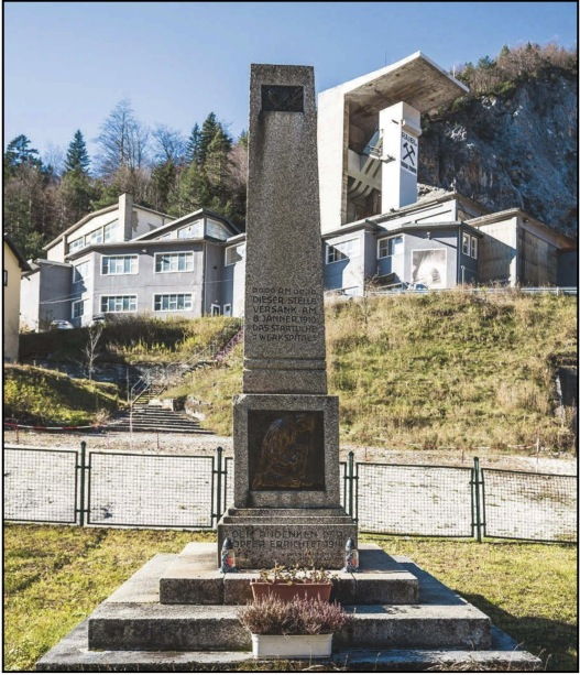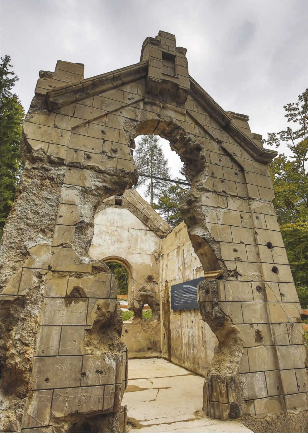 Unterstützt wurden sie vor allem vom Bundesdenkmalamt, das besonderen Wert darauf gelegt hat, den „Ruinencharakter“ zu erhalten. Die Mauern sollen auch ein Denkmal für den Frieden sein. Das ist gelungen, wie wir an Details feststellen: In einigen Einschusslöchern, die aus den 1919 geführten Kämpfen stammen, stecken tatsächlich noch die Projektile. Im Inneren der Kapelle hat man eine Gedenktafel angebracht. Sie erinnert zweisprachig an die 22 hier beerdigten Menschen, bei denen es sich nicht nur um Tunnelarbeiter gehandelt hat, sondern auch um verstorbene Angehörige. Unter ihnen befanden sich vier Totgeborene und drei Opfer von Gewalttaten wie Messerstechereien.