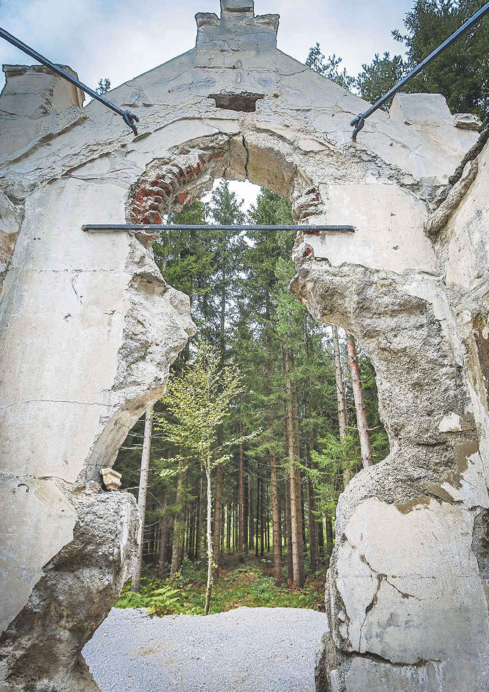Es sollte fast 100 Jahre dauern, bis dieser Lost Place wieder ins öffentliche Interesse rückte. 2016 wurden die Mauern der Ruine konserviert, um sie vor einem weiteren Verfall zu bewahren. Vom Friedhof fehlte zu diesem Zeitpunkt bereits jede Spur – die Natur hat die Gräber zurückerobert. Weil es nur schlichte und mittlerweile längst verrottete Holzkreuze gab, lässt sich die Lage der Gräber nicht mehr feststellen. „Wir wissen, dass der Friedhof zweigeteilt war: in einen Bereich für die Katholiken und einen für die Toten anderer Konfessionen“, erklärt uns Grundbesitzer Peter Janežič. Von ihm und seinem Vater Franz Janežič, der 2014 in unmittelbarer Nähe der Kapelle bei Forstarbeiten tödlich verunglückte, ist die Initiative zur Konservierung derselben ausgegangen.