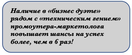 Решение этой двуединой задачи, как правило, не по силам для учредителя-одиночки. Ведь очень редко талантливый изобретатель одновременно обладает даром коммерсанта-промоутера, а исследователь-теоретик хваткой менеджера-организатора. Неудивительно, что большинство экспертов при перечислении уникальных преимуществ инновационных «бизнес-дуэтов» ставят фактор функциональной взаимной дополняемости партнеров на первое место. Так, согласно исследованию группы MicMichelle Hammond, наличие в «бизнес-дуэте» рядом с «техническим гением» талантливого промоутера-маркетолога повышает шансы стартапа на успех более, чем в шесть раз! Кроме того, такие дуэты значительно более успешны в привлечении венчурного капитала, жизненно необходимого для становления стартапа.