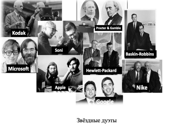 Помимо этого, психологическая совместимость подобных бизнес-тандемов, по-видимому, не уступает совместимости космонавтов. И это неудивительно, ведь им приходится находиться в повседневной «связке» годы, а то и многие десятилетия. Дж. Джакометти, один из создателей корпорации Valentino, отмечал, что «если сложить все время, проведенное нами (им и его партнером В. Гаравани) врознь в течение полувека, то в сумме едва ли наберется больше восьми недель». Неудивительно, что участники бизнес-дуэтов, прошедшие закалку инновационным стартапом, как правило, становятся друзьями-побратимами «до гроба». Во всяком случае, в нашей двадцатке не один из «дуэтов» не прекратил существования из-за внутреннего конфликта или психологической несовместимости партнеров.