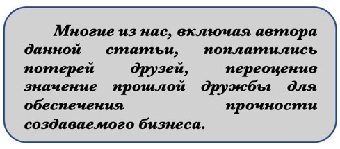 Многие из нас, включая автора данной статьи, поплатились потерей друзей, переоценив значение прошлой дружбы для обеспечения прочности создаваемого бизнеса. Опыт показывает, что «классическая» дружба редко перерастает в долгосрочные партнерские отношения, значительно чаще происходит обратное – совместный бизнес порождает конфликты, ставящие крест на прошлой дружбе. В этом случае уместна аналогия с замужеством на почве сексуального влечения, здесь и там партнерство круто замешано на эмоциях и иллюзорных ожиданиях, не лучших спутниках в преодолении трудностей и тягот новой компании или семьи.