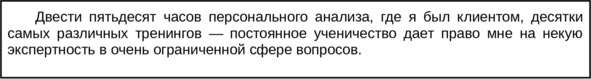 Тут мы снова возвращаемся к программе Духа, когда каждый человек должен находиться на своем месте. Невозможно помочь другому человеку, если ты не помог сам себе. Поэтому «спаситесь сами, и вокруг вас спасутся тысячи» – очень правильная фраза, но ее исполнение требует много мужества. Гораздо проще идти помогать другим, объявляя себя гуру, супер-мастером, причем не обязательно в работе с людьми, где угодно: в строительстве, обучении вождению, ремонте техники. Найти сейчас качественного специалиста становится все сложнее и сложнее. Банальный ремонт в моей квартире делали год три бригады. Я никак не мог понять, что же такого сложного в простом ремонте. А дело в том, что строители видели в этой моей истории конечным результатом не качественно сделанный ремонт, а деньги, которые они хотели получить по итогу.