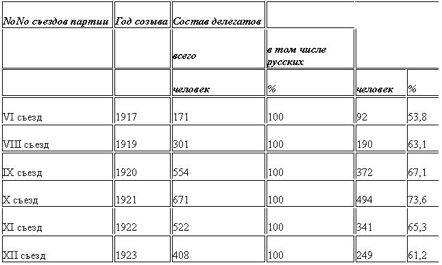 В то время как в населении СССР в первые годы советской власти удельный вес русского населения составлял от 56,9 % до 57,3 %, в составе делегатов съездов русские составляли от 60 до 73,6 %, за исключением VI-го съезда партии, состоявшегося до взятия власти большевиками.