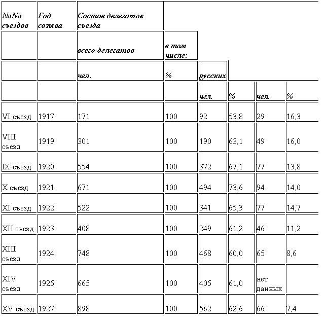 Во главе советской власти по всей стране стояли русские, что видно из нижеследующей таблицы о составе делегатов съездов партии, фактического высшего органа власти СССР: