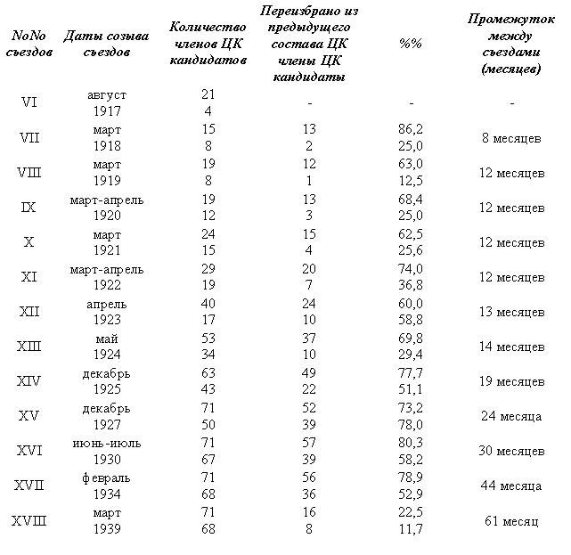 Но подлинным водоразделом является, конечно, промежуток между ХVII и ХVIII съездами партии. До ХVIII съезда, созванного в 1939 году, в составе ЦК сохранялась преемственность: в новый ЦК входило от 63,0 до 87,0 % членов предыдущего ЦК. На ХVIII съезде в ЦК, состоявшем, как и предыдущий, из 71 члена и 68 кандидатов, вошло из старого состава только 16 членов (22 %) и 8 кандидатов (11,7 %).