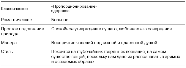 В работе «Простое подражание природе, манера, стиль» (1789) он различает три заглавных типа творчества, которые относятся друг к другу как два полюса к середине. «Простое подражание природе» воспроизводит явления в меру своего мастерства, не чувствуя духа целого; художник здесь проявляет спокойное утверждение сущего, его «любовное созерцание». «Манера» выражает особенность художественной индивидуальности автора, жертвуя конкретными деталями и подчиняя их общему замыслу; происходит «восприятие явлений подвижной и одаренной душой». «Стиль» проникает в саму сущность вещей, не выходя за пределы «видимых и осязаемых образов»; он «покоится на глубочайших твердынях познания», но не за счет абстракций, а благодаря найденному центральному образу, которому подчиняются частности. «Стиль» оказывается таким соединением противоположностей, которое возводит их на более высокий уровень, где объективное и субъективное примиряются. В поздней работе «Искусство и древность» (1821–1826) Гёте дает еще одно емкое пояснение: «Огромная разница, подыскивает ли поэт особенное для всеобщего или видит в особенном всеобщее. В первом случае возникает аллегория, где особенное служит лишь примером, случаем всеобщего; второй случай характеризует собственную природу поэзии, она передает особенное, не думая о всеобщем, не указывая на него. Кто, однако, схватывает это живое особенное, рано или поздно, не замечая, получает одновременно и всеобщее»[34]. Здесь перед нами не что иное, как формулировка гётевского символизма, который окажет на культурологию немалое влияние (табл. 1).