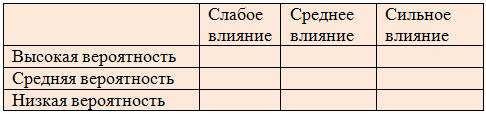 – Какова вероятность его осуществления – высокая, средняя или низкая?