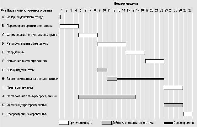 График действий должен быть связан с каждым из ключевых этапов. Определение конечного пункта каждого этапа имеет решающее значение для мониторинга выполнения графика и управления этим процессом.