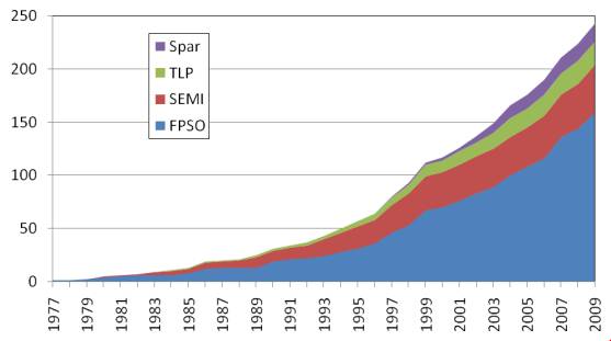 Рис. 1.3. Судно FPSO и распределение систем морской добычи по типам конструкций и годам ввода в эксплуатацию