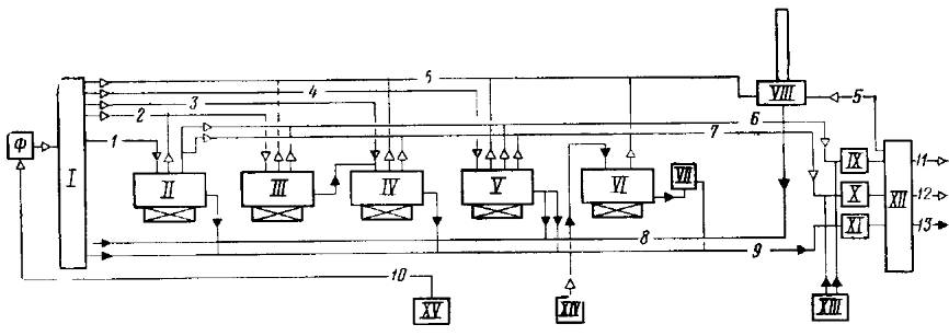 I – группового манифольда скважин, II – замера дебита скважин, III – сепарации газа от конденсата I ступени, IV – сепарации газа от конденсата II ступени, V – освоения и опробования скважин, VI – продувки и разрядки аппаратов и коммуникаций, VII – насосов откачки нестабильного конденсата, VIII – газоотвод с каплеотбойником, IX – оперативного учета добычи газа I ступени, X – оперативного учета добычи газа, XI – оперативного учета конденсата, XII – распределительной арматуры, XIII – дозирования метанола, XIV – сбора и откачки сточных и дождевых вод, XV – глушения и прокачки скважины