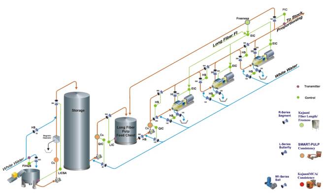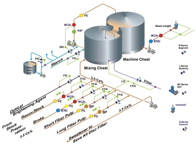При подготовке композиции и различных компонентов массы они смешиваются вместе, чтобы достичь точного соответствия композиции производимой бумаги. Наполнители обычно добавляются напрямую в поток массы перед очистителями в пропорции к потоку готовой массы. Дозирование должно быть легко повторяемо, и дозирующая система включает возможности различных сочетаний и степени регулирования для различных типов масс. Требуемые условия течения могут широко варьироваться для различных типов бумаги. Клапаны могут требоваться для перекрытия потока при помощи очень небольшого открытия в ситуации низкого расхода. В этом случае рекомендуется V – тип сегментного клапана. Нелинейность (мертвый ход или трение) одного из клапанов вызывает проблемы по пропорции компонентов массы. Нестабильность и ее изменения могут быть также и внезапными, влияя на результаты размола (значение садкости). Наполнители добавляются в массу, чтобы улучшить оптические и печатные свойства бумаги. В простых машинах наполнители управляются при помощи клапанов и идут напрямую в смесительный бассейн в пропорции с полным расходом массы. Все неконтролируемые изменения в пропорции наполнитель – масса являются критическими по отношению к технологическому процессу производства бумаги. Они должны учитываться при расчете удержания и также при расчете содержания золы (остающейся на полотне сухой бумаги).