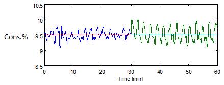 В концепции управления концентрацией контроллер, работа которого основана на балансе массы, используется в комбинации с каскадным регулированием расхода разбавительной воды. Ключ для улучшенного регулирования состоит в том, что некоторые измерения стандартизированы. В дополнение к концентрации массы, также измеряются расход массы, расход разбавления и входящая концентрация (опции). С использованием уравнения баланса массы точное количество разбавляющей воды может быть безошибочно вычислено в каждой ситуации. Сравнение между концепцией регулирования концентрацией (время менее 30 мин) и обычным временем регулирования (больше 30 мин) для одного применения по регулированию концентрацией, приведены ниже на рис 2.1.4.