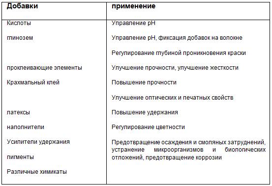 В добавление к обычным базисным свойствам бумаги (базовый вес, влажность) существует другие важные категории качества или сортность бумаги, такие как цветность, яркость, матовость и глянец. Эти свойства могут быть эффективно управляться при помощи соответствующих химикатов. Следующая таблица иллюстрирует различные добавки и их применения.