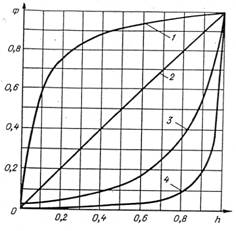 Характеристики клапана замеряются в условиях, когда перепад давления постоянен. В этом случае величина потока, проходящего через клапан «q» пропорциональна его коэффициенту пропускной способности Сv. Так как коэффициент пропускной способности клапана выражает со своей стороны эффективную величину поперечного сечения потока, то по характеристике клапана можно видеть, что эффективность поперечного сечения потока меняется в функциональной зависимости от степени открытия «h» клапана. На рис 2.1.7. представлены пропускные характеристики наиболее распространенных клапанов в их функциональной зависимости от коэффициента пропускной способности Ф и степени открытия h.