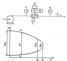 На практике регулирующий клапан – часть технологического трубопровода. Перепад давления в зоне открытия клапана редко постоянен, т.к. при росте величины потока вследствие динамических потерь давление потока на входе клапана падает, а на выходе увеличивается. Поэтому зависимость величины потока q от степени открытия клапана h (вид установочной характеристики) есть функция как технологического трубопровода, так и внутренней кривой клапана. Влияние изменений перепада давления на регулирующий клапан, установленный в технологическом трубопроводе, показан на рис 2. 1.8.