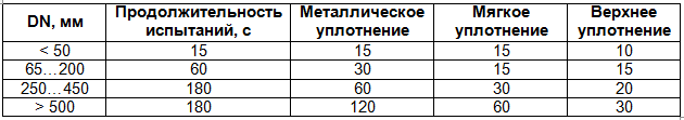 Испытательная среда должна подаваться по направлению движения рабочей среды. Клапаны с сальниками должны проверяться подачей среды в противоположном направлении. Для определения герметичности верхнего уплотнения клапан полностью открывают. Испытание места уплотнения должно быть выполнено в течение минимального периода, указанного в табл.1.11.