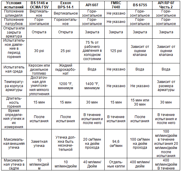 Хотя имеются некоторые различия в рабочих средах, условиях потока, топливе, продолжительности воздействия огня, размерах труб, и ориентации арматуры, также как в методах измерения и допустимости протечек, которые являются приемлемыми, цель каждого испытания в том, чтобы установить минимальный безопасный по огню уровень для арматуры в эксплуатации. В многомиллионном химическом процессе, арматура может играть роль, которая является полностью непропорциональной её размеру и стоимости.