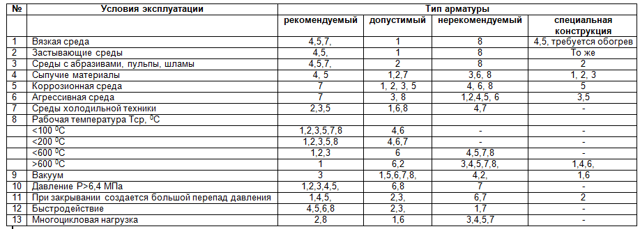 Некоторые рекомендации по выбору арматуры для конкретных условий эксплуатации приведены ниже: