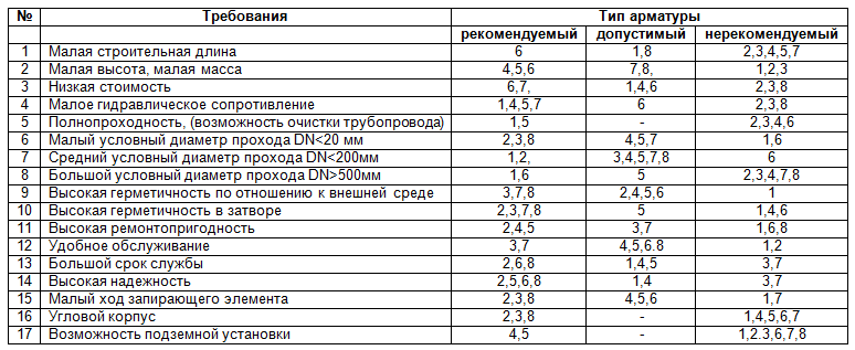 Табл. 1.16. Применение арматуры в зависимости от предъявляемых требований и условий эксплуатации