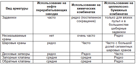 Опыт эксплуатации арматуры может также определять тип арматуры, которую нужно использовать. Различные отрасли промышленности предпочитают, чтобы специфическая арматура отвечала их требованиям. Многое зависит также и от привлекаемых инжиниринговых компаний, имеющих определенный опыт включения арматуры в свои проекты. Данные показаны в табл. 1.18.