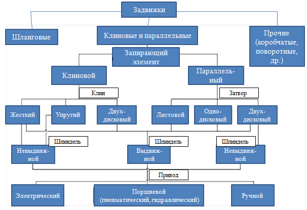 Задвижки клиновые делятся на задвижки с жестким сплошным и упругим клином, а также двухдисковые. Задвижки параллельные делятся на листовые (шиберные), однодисковые и двухдисковые.