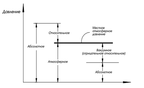 На рис. 1 можно увидеть соотношения между абсолютным, относительным и вакуумным давлениями.