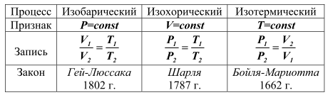Возможны частные случаи уравнения состояния идеального газа, когда один из этих параметров остается постоянным, табл.1.