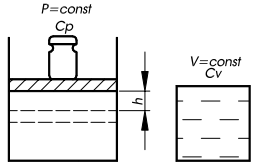 При нагреве газа при Р=const он совершает внешнюю работу по подъему груза на некоторую высоту, поэтому необходимо затратить дополнительное количество энергии. Поэтому Cp > Cv.
