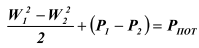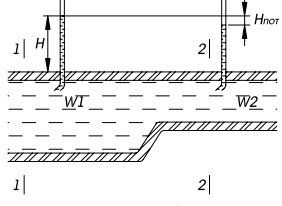 На рис. 11. представлен сужающийся трубопровод, в двух сечениях которого установлены трубки Пито, измеряющие полное давление, которое почти одинаково в обоих сечениях, хотя скорость W2 > W1 как это следует из уравнения неразрывности потока.
