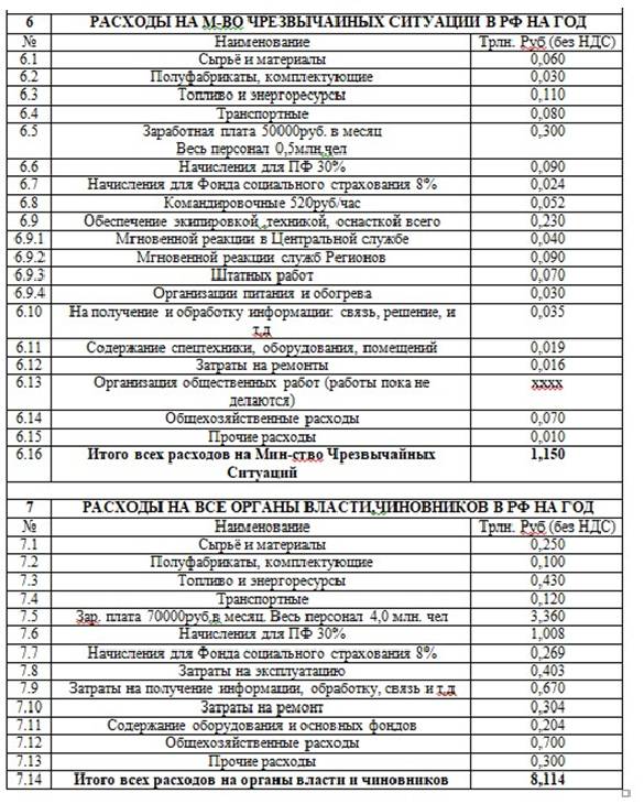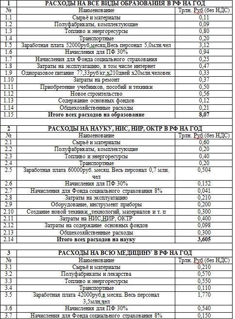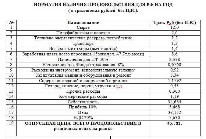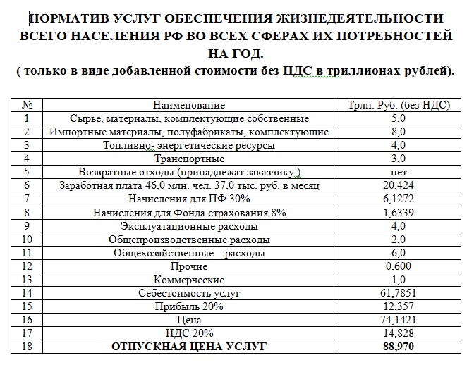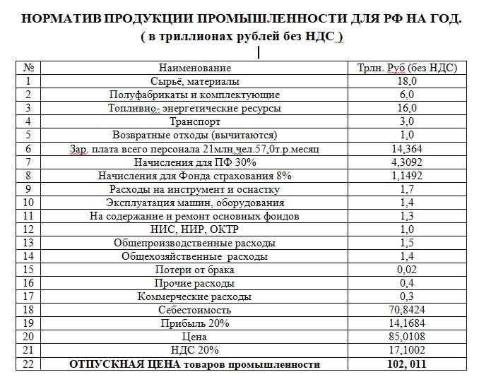 Сумма начисленного НДС на продовольствие, продукцию промышленности и услуги = 39,5582 трлн. руб. минус бюджетные расходы 39,508 трлн. руб.= неизрасходованному остатку 50,2 млрд. руб. Сумма пенсионных начислений за год по нормативу составляет 12,9744+3,2700=16,2444 трлн. руб. и если вычесть выплаченную среднюю (12000 руб. х 12 месяцев х 42 млн. чел.= 6,048 трлн. руб.) за год, получим резерв 10,1964 триллионов рублей для Кудрина и Ко, что же его команда и прочие «специалисты-экономисты» резервов не видят. Кроме этого есть еще неучтённые мной резервы для формирования бюджетов всех уровней. Это налоги в виде акцизов, доходов физических лиц -подоходный , с прибыли, добычи полезных ископаемых, с водного мира, животного мира, рыбного мира, растительного мира, госпошлин, имущества организаций, транспорта, игорного бизнеса, земельного и я не нашёл нигде наличия экологического налога , а ведь всё население в сутки гадит в экологию не менее одного кг., а это загрязнение водной среды и воды для питья, ну эти все доходы и без меня уже расписаны и составляют как минимум 12% к себестоимости нормативов продовольствия, промышленности и услуг в сумме 20,0 трлн. руб., то есть с каждого жителя можно взимать ежемесячно по 15 руб. без детей. Мной же выданы расчёты, которые будут сверх полезны всем руководителям , районов, городов ,областей, республик, министрам и правительству, почему, да просто на основе Ваших расчётов удельных величин по каждой статье моих нормативов делаете для себя свои нормативы, или даже просто сравниваете свои фактические величины своих статей затрат с моими и Вы наглядно сможете увидеть, что требует изменений, роста или уменьшения затрат и получения более высоких результатов и главное Вы сможете видеть весь регион или страну от общего к частному и наоборот