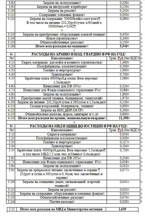 7.3. Перед выплатой заработной платы всем рабочим и всему персоналу оказывающих все виды услуг из неё производятся за месяц работы отчисления в виде удержаний 13% подоходного налога и их суммы перечисляются в бюджеты местных органов власти 1702 млрд. руб. х 0,13 = 221,26 млрд. руб. х 12 месяцев = 2,65512 триллионов рублей за год. К выплате за месяц заработная плата равна 1702-221,26 = 1480,74 млрд. руб. Выплата заработной платы за год составит 1480,74 млрд. руб. х 12 мес. = 17,76888 триллионов рублей. Теперь рассчитаем нормативы по ниже приведенным статьям расходов.