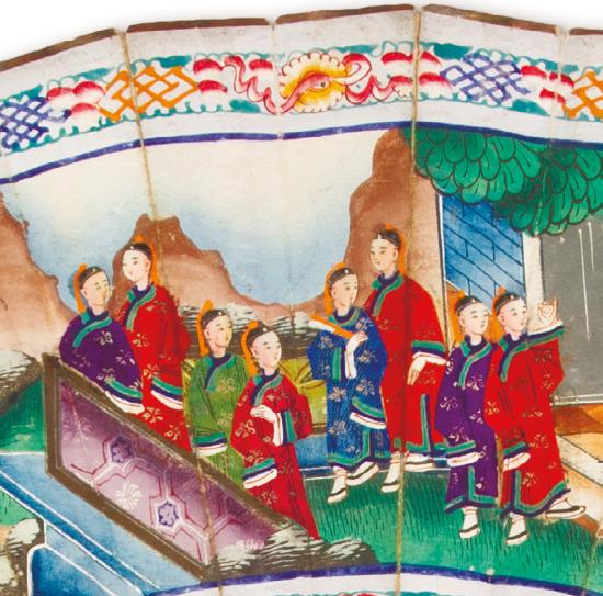 Веер плие, бумага, печать, раскрашенная гравюра.